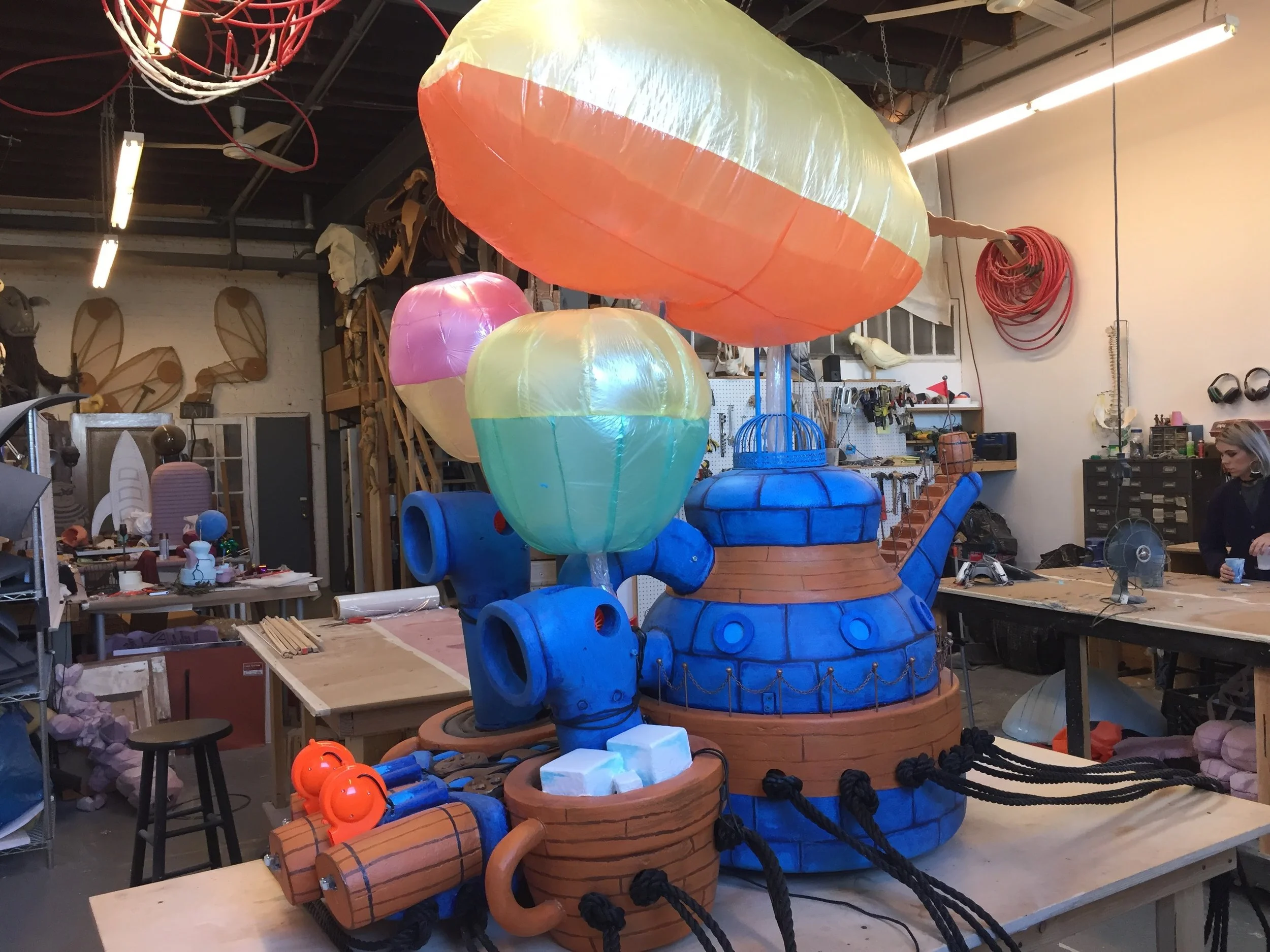 Once we had initial prototypes with rough materials such as cardboard and paper, we did some user testing before we began the higher level fabrication. Most of the pieces were made out of wood, foam, paint, and had electronics hidden inside to create various interactions such as the air ship pictured, has several fans that inflate the balloons once triggered by the user.